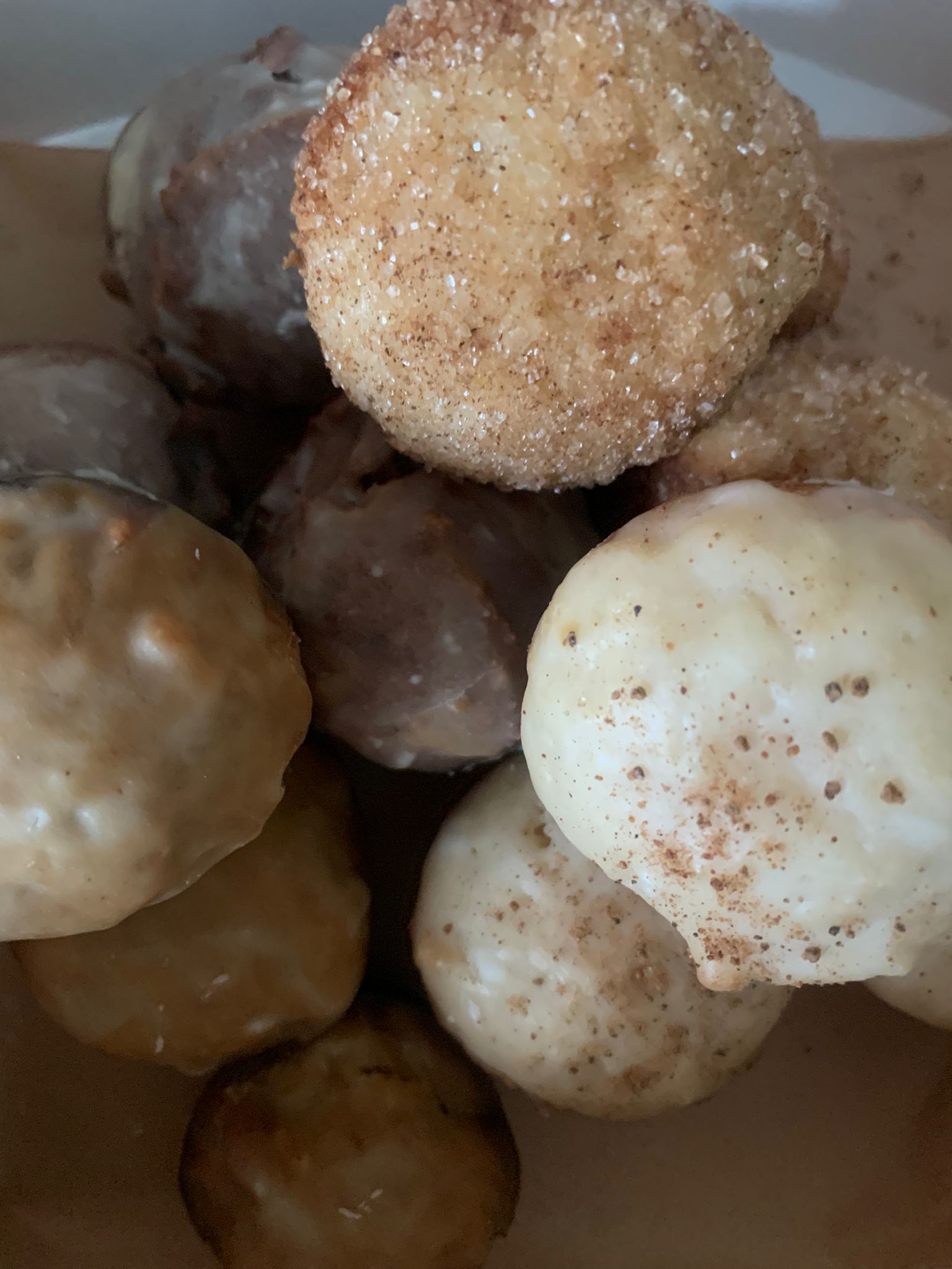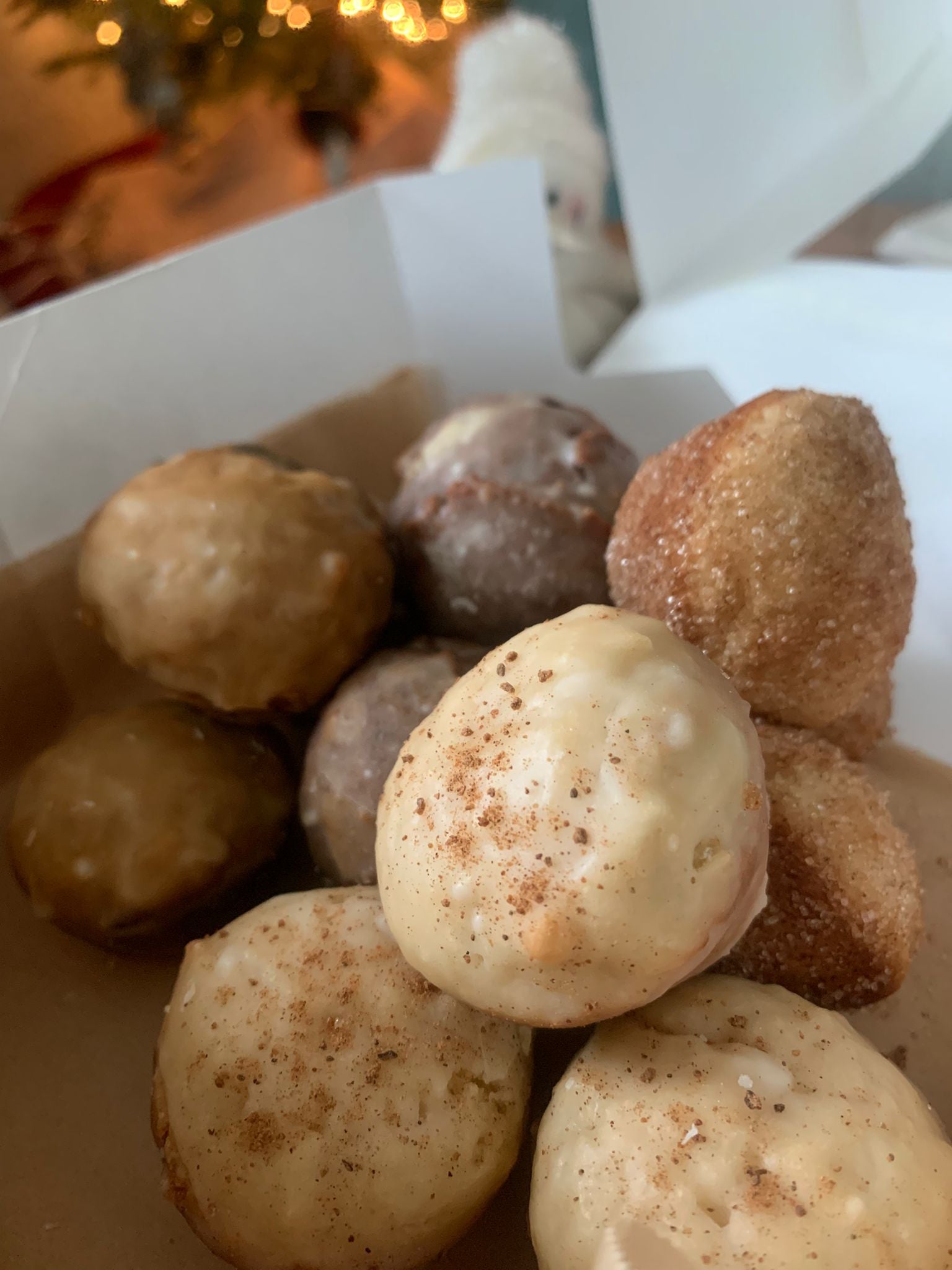Doughnut Hole box includes: eggnog, cinnamon sugar, chocolate glazed, gingerbread