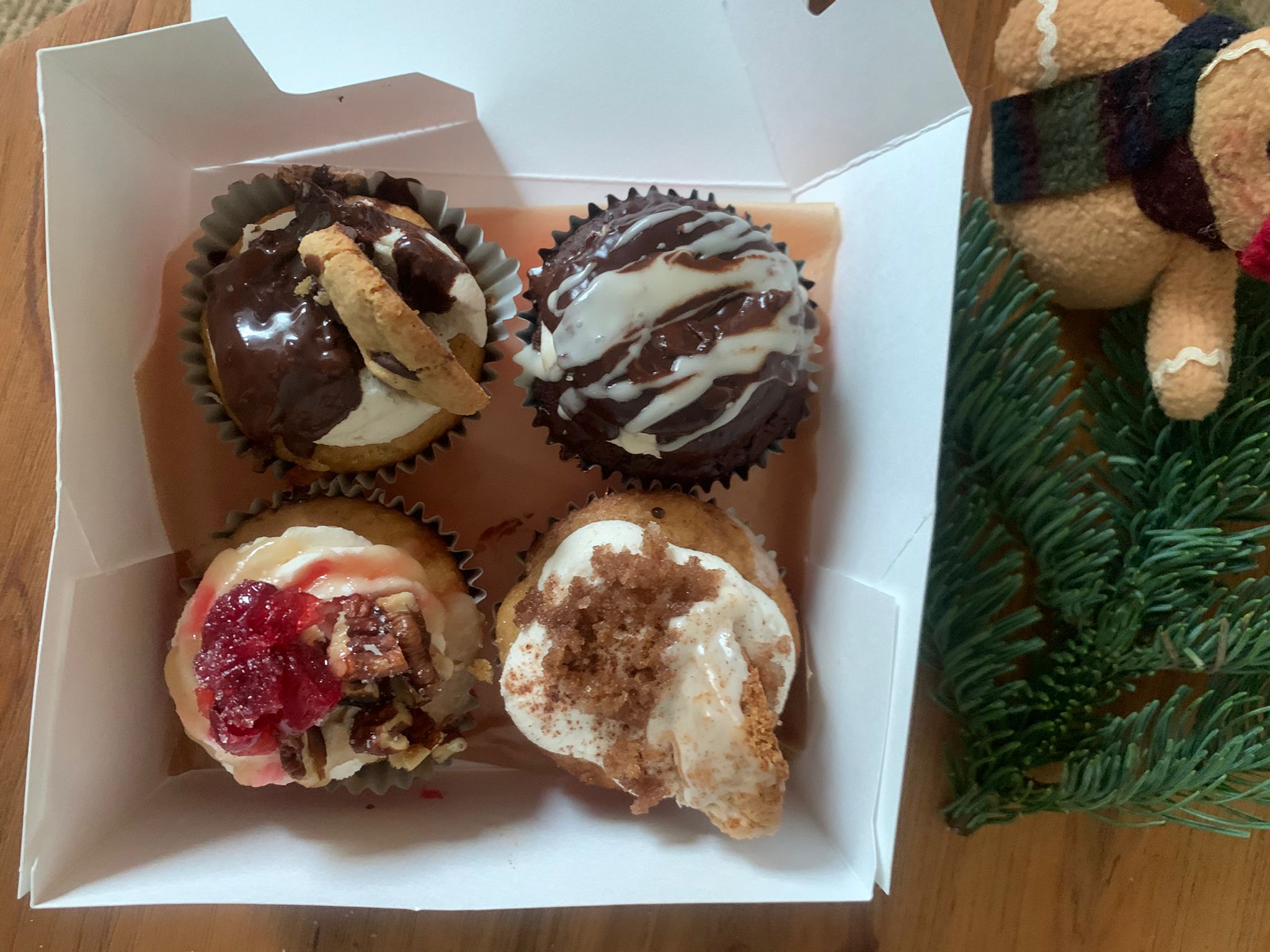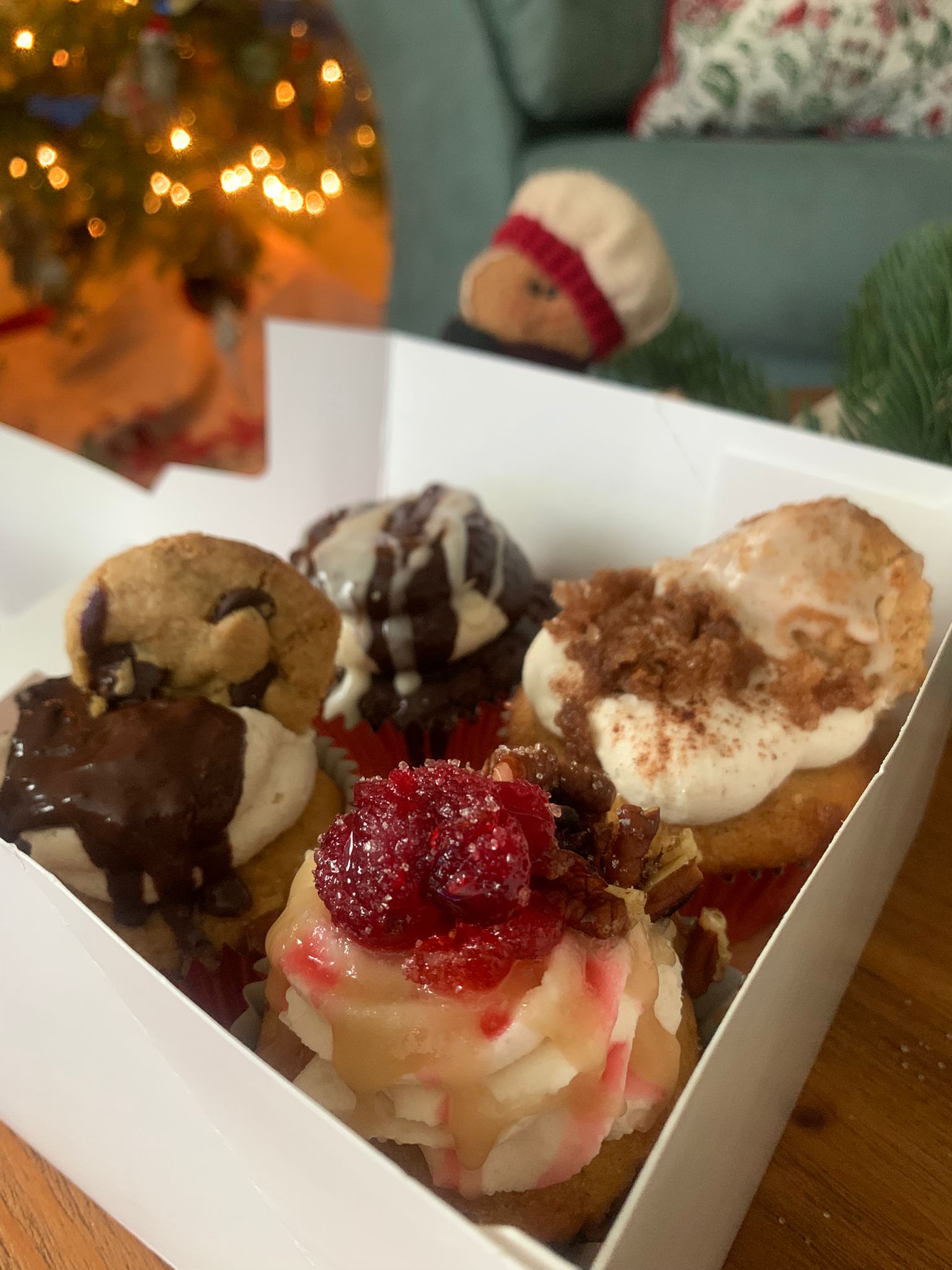 Cupcake box includes: Christmas cupcake, chocolate "cream puff", cookies & "milk" & cinnamon roll